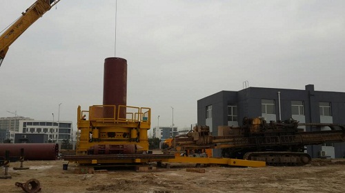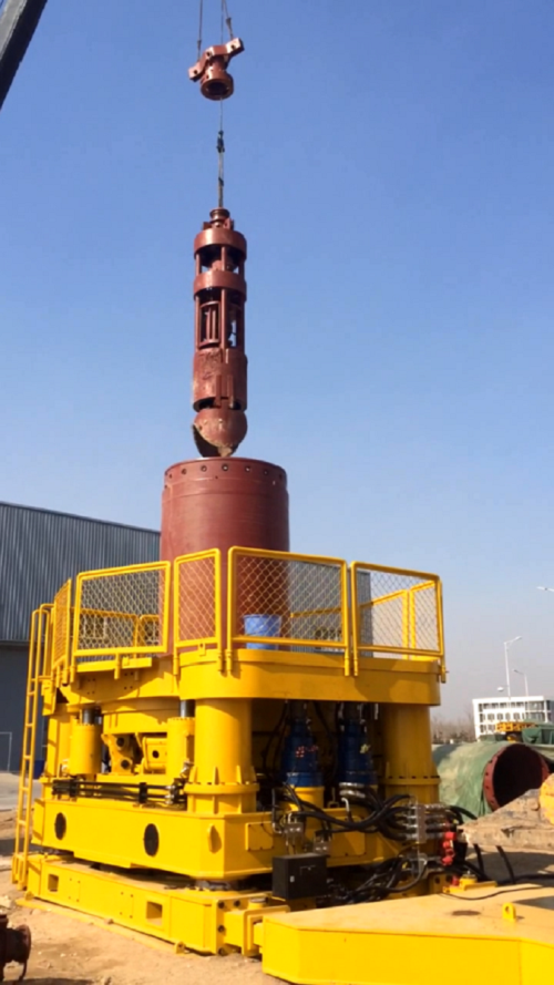 QHZ-2000钻机试验钻进套管直径1500mm,套管长度30m。由于试验条件有限,采用套管内不取土的钻进方式。试验目的主要是检验钻机的各项动作是否正常,实钻参数是否达到了设计要求,检测液压系统和PLC电控系统的稳定可靠性以及机械结构的强度,同时检验自制全回转刀齿的寿命及磨损情况。套管实钻试验进行了二轮。第一轮在套管内冲抓取土的条件下连续钻进套管8m后钻机下部地基沉降明显,虽然有孔口机台板,钻机仍然发生了倾斜,无法继续钻进。第二轮钻进试验前新孔位的地面进行了简单的平整硬化,钻机下部设置了8根250*250*5000mm的方木筏子作为钻机底架的基础,稳定钻机的同时增加了20吨配重。第二轮在不取土条件下一次性钻进套管18m,纯钻进套管的时间为3.75h,由于套管内未取土形成了土芯,钻进下压套管无法继续进尺,此时的回转扭矩达1300KN-m,回转速度0.52rpm,下压力达1210KN。4月15日钻机的室外功能性钻进试验圆满结束,试验结果表明钻机的机械、液压、电控各系统工作正常,各项实钻参数基本达到了设计要求,钻机的试验成功为下一轮的生产试验做好了技术准备。