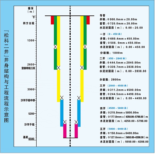 按照设计,“松科2井”的钻进分5个阶段进行。“一开”阶段,660毫米大直径开孔,钻进至450米;“二开”阶段,钻进至2840米,局部取芯;“三开”阶段,钻至4500米;“四开”阶段,216毫米直径钻进至5800米;“五开”阶段,转换为152毫米直径取芯钻进至6400米。在钻进的同时,跟进测井和录井工作,并开展测井、录井资料的录取与解释。