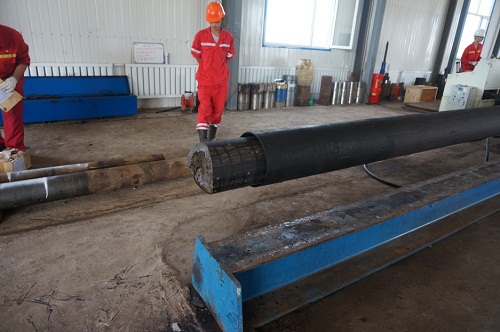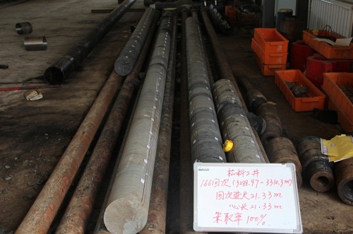 图3 取满岩性的20m取心钻具内管,正等待出心