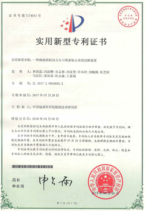 “一种海底钻机动力头与绳索取心系统切换装置” (专利号:ZL201720930845.X),包括动力头、绳索取心系统、滑移架和滑移油缸,本实用新型专利实现了动力头与绳索取心系统的自动切换、岩心管与打捞器脱卡动作的自动化操作,从而可将绳索取心技术应用在海底深孔钻机上,达到了减少辅助作业时间、提高工作效率和岩心质量的目的。