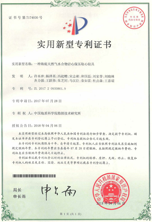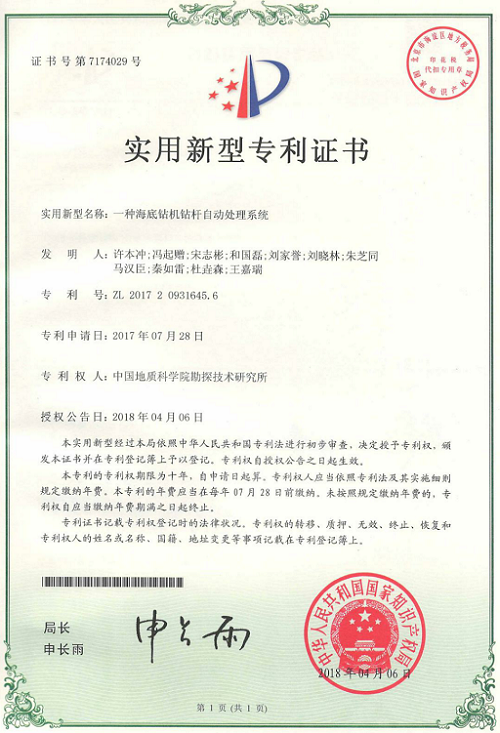 我所研制的海底钻机动力头与绳索取心系统切换装置、海底天然气水合物岩心保压取心钻具、海底钻机钻杆自动处理系统,分别获得国家知识产权局实用新型专利授权。