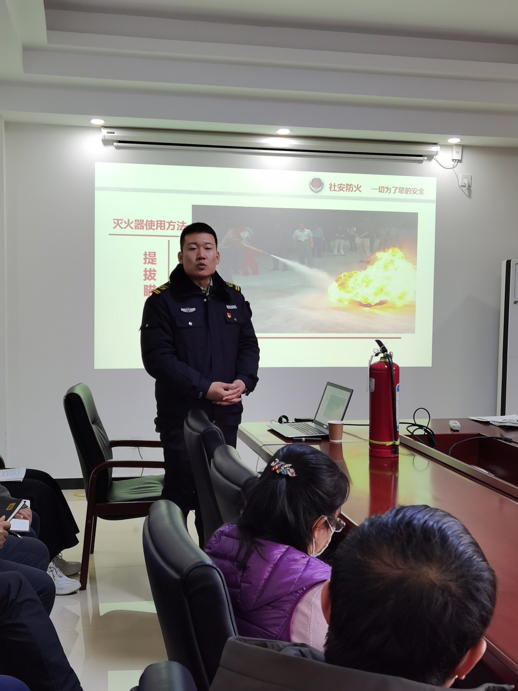 本次培训内容主要从三个方面展开:一是利用身边的火灾事故案例和统计数据说明消防安全的重要性,提醒大家重视消防安全,警钟长鸣,珍爱生命;二是普及日常生活中的消防安全注意事项,现场演示灭火器的正确操作方法,帮助大家养成良好灭火习惯,降低火灾风险;三是通过专业人员灭火实验展示不同灭火器的使用方式方法,及灭火器的日常储存和保管,教育大家要科学灭火,冷静应对,避免造成人身安全和财产损失。