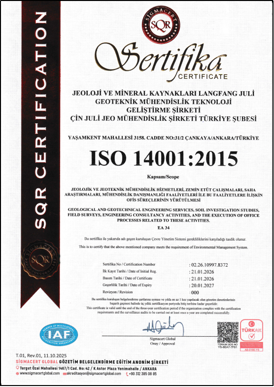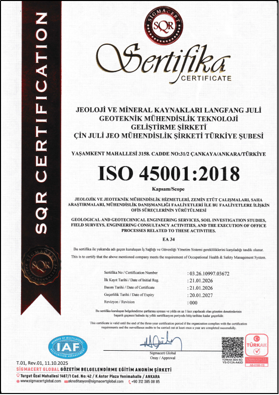 近日,勘探技术所聚力公司土耳其分公司经国际权威认证机构SQR CERTIFICATION的全面审核,成功获得ISO 14001:2015环境管理体系认证与ISO 45001:2018职业健康安全管理体系认证。此次认证标志着公司在海外工程领域的合规管理、绿色运营与安全管控能力已达到国际标准。