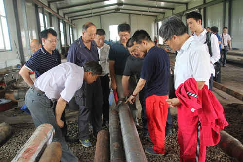 “松科二井”因井内高温、地应力释放等综合因素影响,五开钻开后套管下部的裸眼井段发生大规模坍塌,严重阻滞了“松科二井”五开取心钻进工作的开展。27日上午,我所深部钻探室王稳石工程师向与会专家汇报了“松科二井”五开井内坍塌复杂情况及工程进展情况。随后,专家参观了井下复杂情况处理所用的钻井工具。6月27日下午至28日上午,与会专家与合作厂家针对“松科二井”目前所遇的问题同井场相关技术人员进行研讨与交流,提出了“松科二井”五开复杂井况处理建议及五开超高温泥浆体系的调整方案。